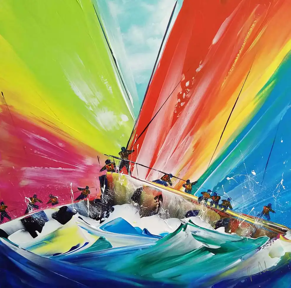 With the sea nearby, works are combined with her other great love of sailing. She makes regular trips around the coastline of Scotland, southern England, Wales and Ireland to sail and also to observe the changing scenery and find new ideas for her work. Although the majority of her work relates to the sea, she is also an accomplished landscape painter where a passion for nature comes to the fore, particularly in her floral works plus subjects which involve an element of speed and colour such as motorsport and horse racing are also included in the range of work.
