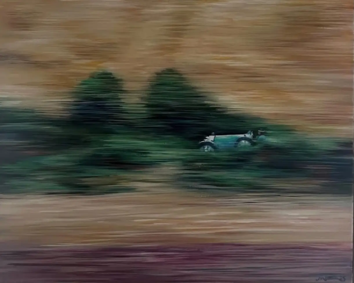 Original painting of a Bugatti Type 35 motoring at speed through the countryside. Simply wonderful