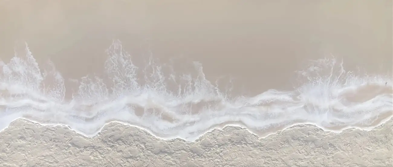 Created in a gorgeous beige palette, glossy resin evokes the reflective nature of water, while the stone-textured coastline anchors the composition with weight and tactility.